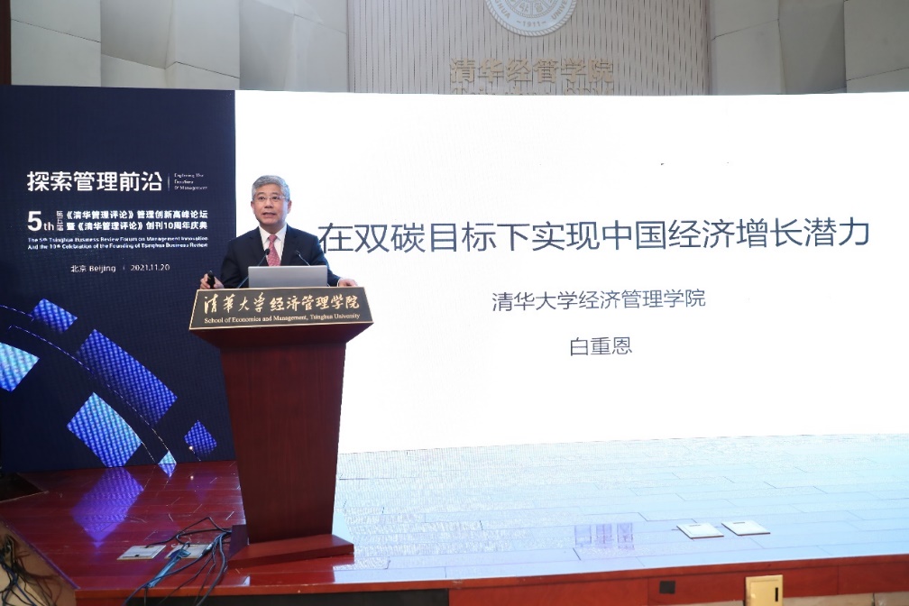 在“热点”主题演讲环节,经管学院院长白重恩教授围绕“在双碳目标下实现中国经济增长潜力”发表演讲。他首先介绍了中国人口红利减退、疫情冲击、国际政治挑战和新技术蓬勃发展等因素对经济增长的影响,引出双碳目标是影响经济增长的另一重大因素,带来了挑战和机遇。在挑战方面,中国碳排放尚未达峰,并且高度依赖煤电,要实现碳中和需要克服许多困难。在机遇方面,白重恩认为双碳目标可以促进中国经济高质量发展。双碳目标使得创新更加紧迫,推动创新。以双碳目标促改革,推动能源部门价格和准入改革,加快数字化,实现更具活力的企业替代依赖垄断和保护的企业成为能源市场的主力,资源配置更加市场化。白重恩说,在新能源和减排方面,中国有能力为全球的碳中和需求作出较大贡献;碳中和目标带来的能源结构转型可以改善中国能源安全;碳排放指标的分配更多向普通居民倾斜,有利于推动能源价格改革,促进更高效率减排,也为实现共同富裕提供另一个抓手。最后,白重恩强调要充分发挥市场力量,并提出设立碳排放权交易和碳税统筹使用的新机制。