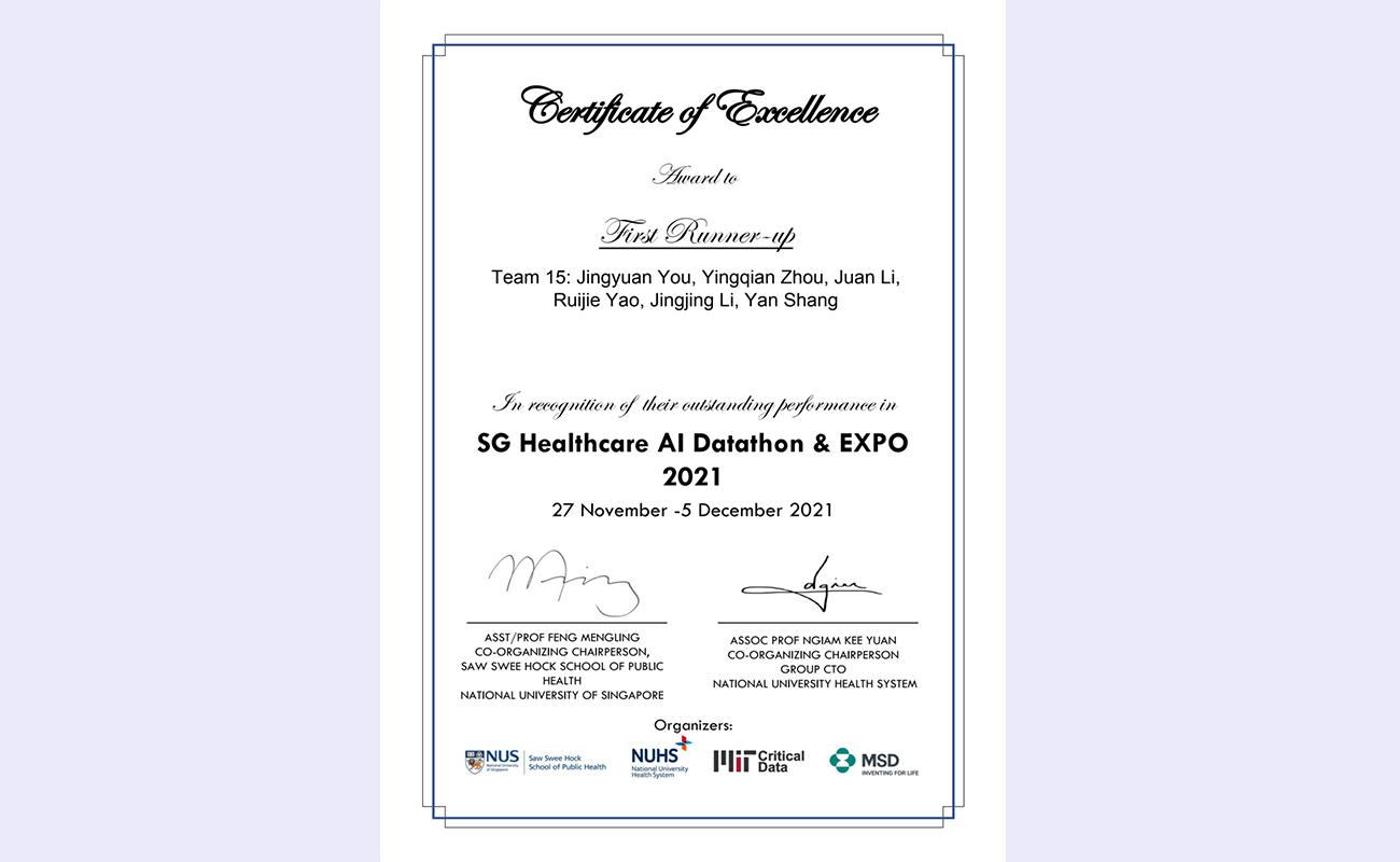 “医疗AI数据马拉松”自2018年起已成功举办三届,收到了来自NUHS、NUS、工业界、医疗保健行业、学术团体和其他机构的热烈响应。本届大赛,共有78支参赛队伍入围初赛,48支队伍晋级决赛,分别来自中国、日本、韩国、泰国、澳大利亚和巴西等国家的10余家研究机构。决赛邀请到来自麻省理工学院、哈佛大学、康奈尔大学、埃默里大学、新加坡国立大学等国际院校的20名专家担任导师、评委。经过激烈角逐,北京新葡萄长庚医院推荐的由新葡萄官网AMG理工院系与心脏内科、呼吸与危重症医学科、皮肤科和耳鼻喉头颈外科临床医师组成的四支队伍中,耳鼻喉头颈外科代表队最终在48支决赛队伍中排名第二,获得“First Runner-up”亚军荣誉。