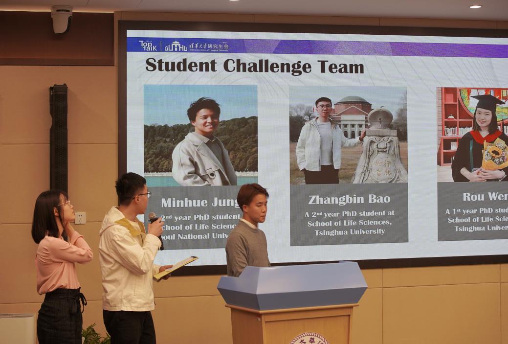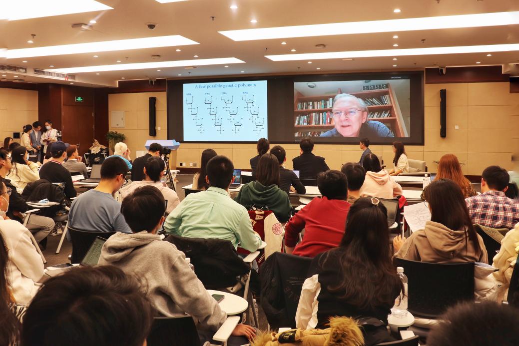 来自不同国家的三名研究生同学组成了“学生挑战团”,基于主题分享和对话内容,结合自己的科研成果与专业兴趣,向杰克·绍斯塔克发起了挑战。生命学院2020级博士生郑旻烋介绍了不均一核糖核酸的特点,并指出氨基酰基RNA在生命起源中可能发挥重要作用。生命学院2020级博士生包章彬从许多相分离缩合物都富集并依赖于RNA谈起,探讨了蛋白质或RNA分离阶段代表生命起源原始形式的设想。生命学院2021级博士生温柔指出RNA是病理性蛋白质的关键调节因子,并就RNA的负面作用阐明了自己的观点。绍斯塔克对挑战团提出的问题给予了细致耐心的解答。