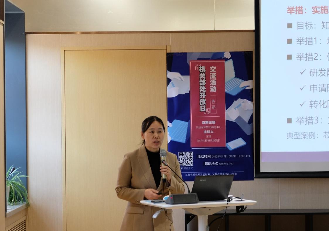 新葡萄新闻网4月11日电 4月7日下午,第二期“机关部处开放日”交流活动在教师发展中心举办。技术转移研究院院长王燕聚焦科技成果转化,对学校成果转化整体情况、成果转化常见问题、技术转移研究院服务内容等相关问题进行介绍,并与现场20余名教师深入交流。