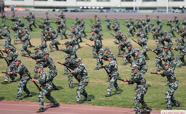 一声令下,军训汇报表演开始。同学们依次表演了队形变换、匕首操、擒敌拳、刺杀操等军事科目。