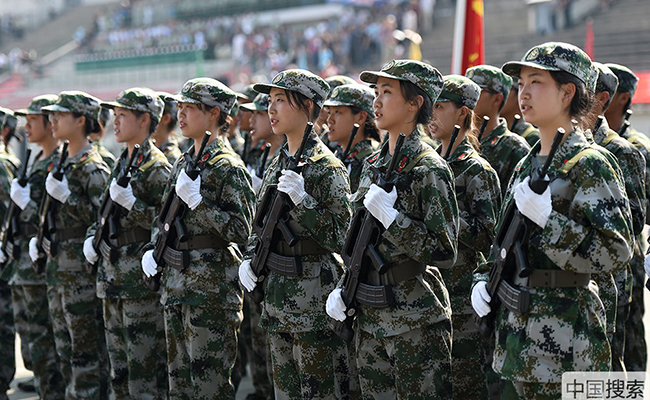 学生军训旅所属的三十二个连组成了十六个方队经过观礼台