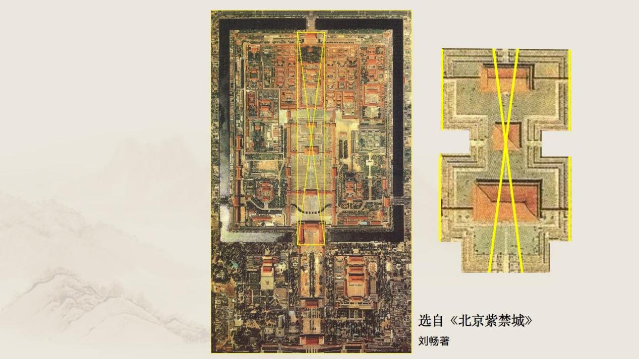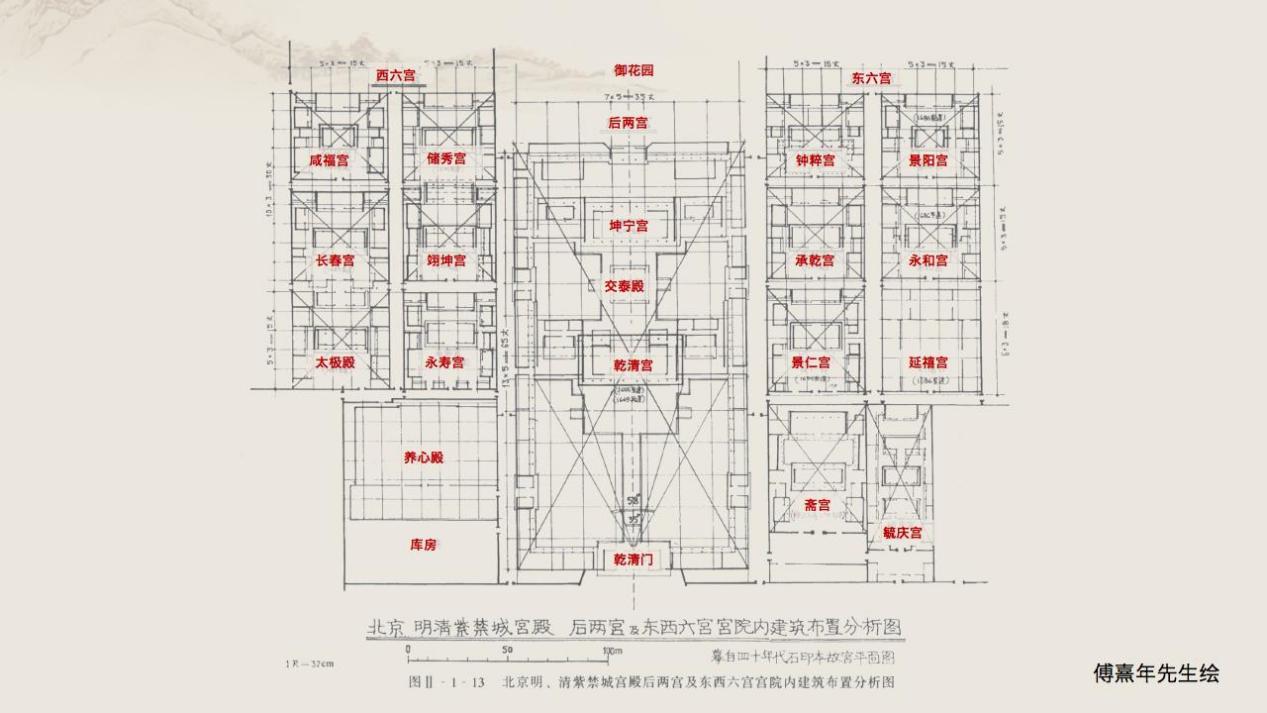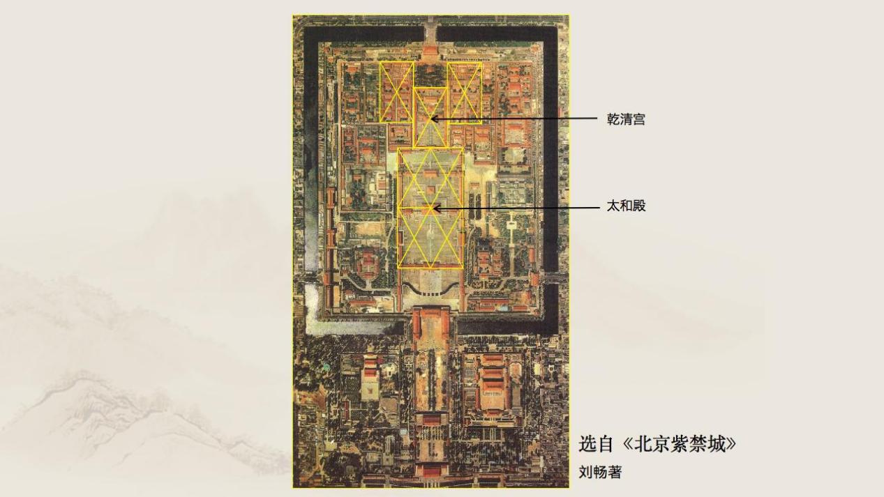 故宫的总体规划除了中轴线两侧的对称关系,设计也非常精密。刘畅介绍,著名建筑史学家傅熹年先生研究发现,乾清宫和坤宁宫区域面积是从太和门到乾清门距离的1/4,同时这个区域也是用来控制周边其它后宫区域面积的比例尺。如果给乾清宫和坤宁宫区域打个交叉线,乾清宫正殿正好在交叉点上,把正殿放在交叉点上的做法,在其他各宫的建设中也都使用到。这个设计手法古已有之,宋代的李诫在中国古代建筑专著《营造法式》里说过“况神畿之千里,加禁阙之九重,内财宫寝之宜,外定庙朝之次,蝉联庶府,棋列百司……”