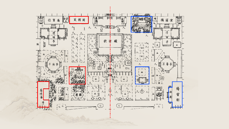 张淑娴特别指出,御花园虽然遵循着均衡对称的布局,但又不是完全的对称,富有变化,东边凸出的绛雪轩与西边凹字形的养性斋,东边山石堆砌的堆秀山与西边对应的两层楼的延晖阁等等都体现了这种活泼的变化。