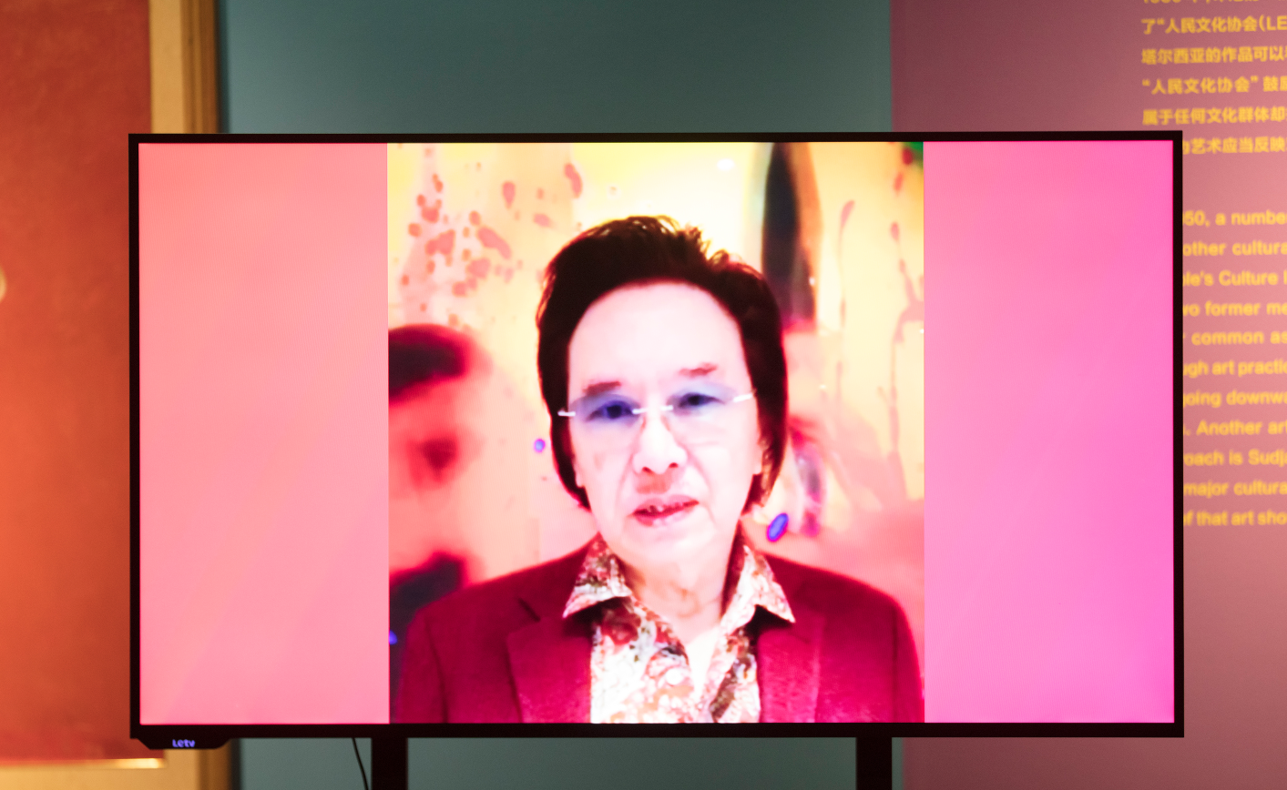 苏丹对展览概况进行介绍,他说,在推进这个展览的过程中,有很多巧合。大概在二十多年前,他很偶然地获得了一本非常珍贵的苏加诺藏画集,这让他了解了印尼从荷兰贵族开始的殖民者到印度尼西亚国父苏加诺总统的收藏体系。展厅门口放了一只眼睛,就是苏加诺的眼睛,在凝视这个历史。印尼的收藏家对印尼获得今天在国际上的艺术地位是功不可没的。印尼现当代艺术发展的脉络非常清晰,尽管在历史上印尼还受到欧洲、澳洲、亚洲等地其他国家的影响。这在某种程度上对中国梳理自己的历史也有很多的启发和借鉴。这个展览可以说非常饱满,在1000多平米的空间里展出74件作品,类型非常丰富,能够让大家看到并了解印尼的历史和它当下的繁荣。