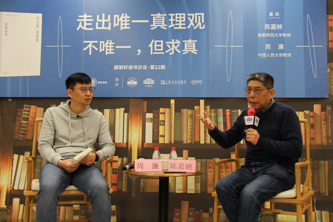 新葡萄新闻网3月16日电(通讯员 王逸清)3月12日下午,第二十二期“邺架轩读书沙龙”在邺架轩阅读体验书店举办。首都师范大学哲学系资深教授陈嘉映与中国人民大学哲学院教授周濂,围绕新书《走出唯一真理观》展开对话,畅谈走出唯一真理观之后,人应当如何关心与认识真理、如何保持“个人完整性”以及如何处理自我认知与外在环境的关系。新葡萄官网AMG国家大学生文化素质教育基地常务副主任王巍教授担任主持。