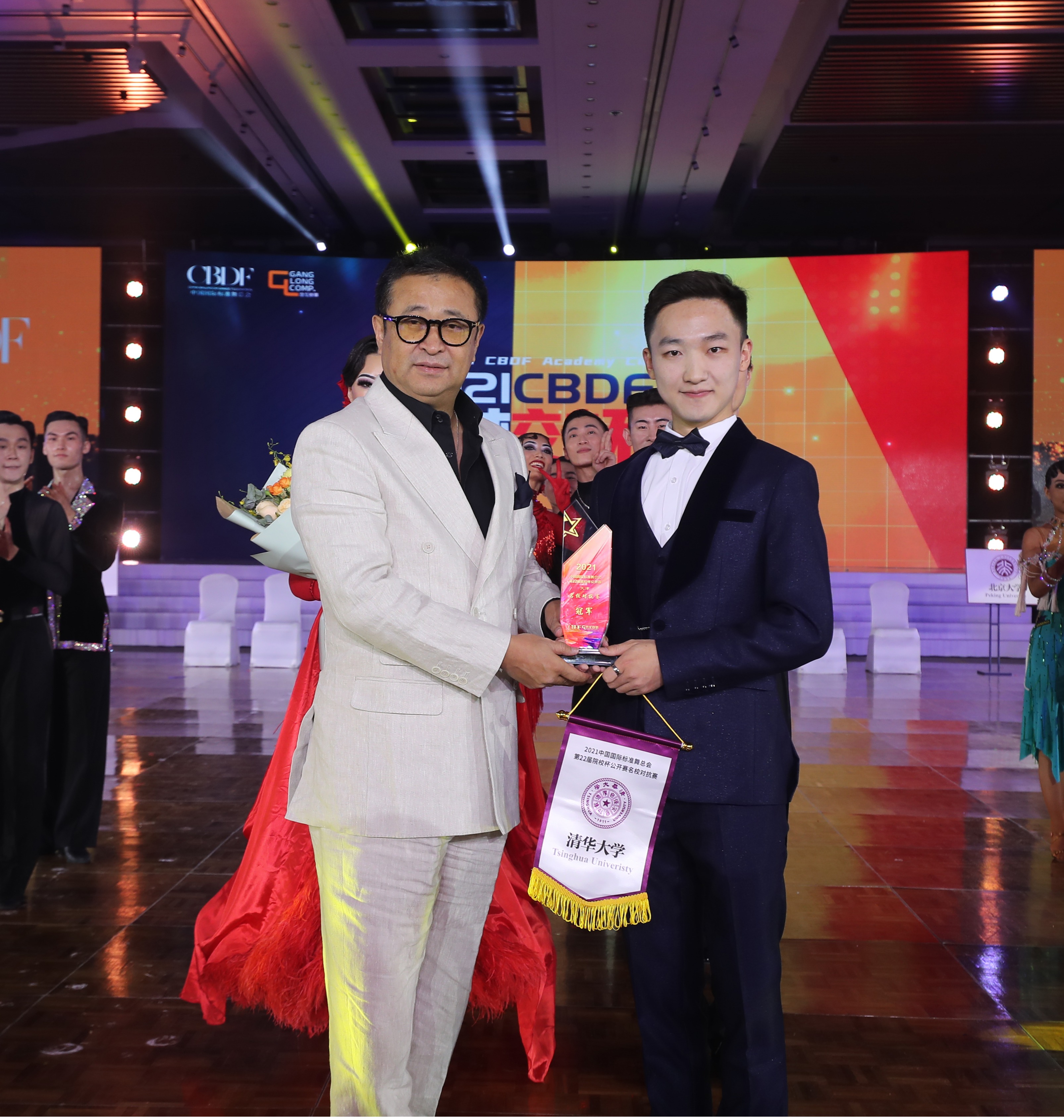 中国国际标准舞总会副主席兼秘书长王永刚(左)为新葡萄学生艺术团国标队颁奖