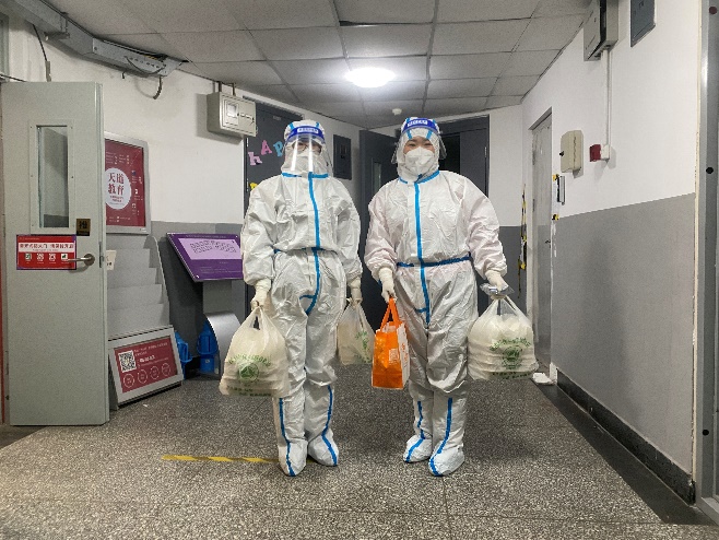 入驻西区36号楼的海外学习办公室蔡晓丹表示,在驻楼工作前自己从未穿过大白防护服,这次真正穿上并开展工作时,看着面屏内侧随着呼吸产生的淡淡白雾,听着耳边防护服摩擦的沙沙声,感受着渐渐从微汗到大汗,努力完成着一趟趟的餐食、体温计、药品、瓶装矿泉水配送,心中对这三年来疫情防控前线每一位工作者的敬意更加浓厚,也愈发坚定驻楼工作的信念。战略合作办公室的胡雪丹入驻了西区35号楼,她谈到,虽然工作千头万绪,但令每位前线驻楼教师倍感安心的是,学校的疫情防控指挥体系在持续变化的情况下高效平稳地运转着,各个环节层层相扣,这样坚实的组织保障,使得每一位新加入的力量都得以迅速找到状态。