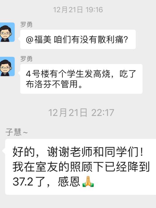 守护学生健康也是驻楼老师工作的重中之重。指挥长罗勇的手机24小时待机,一旦收到同学发烧、需要药品等信息,快速协调,让有症状的同学按照说明准确用药,时刻关注着学生的生命健康安全。