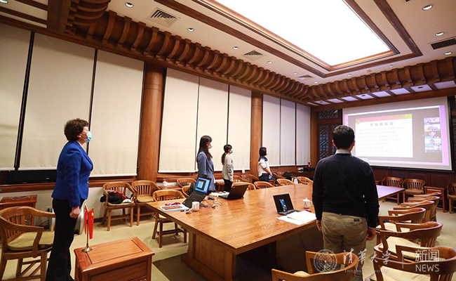 活动最后,大家齐唱《国际歌》。最后,同学们一起喊出了“武汉加油!湖北加油!中国加油!”的口号,大家的声音从每一面屏幕前传来,汇聚成久久回响的强音。