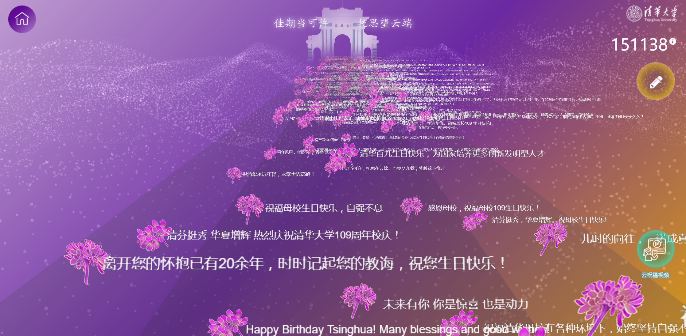 打开校庆专题网站祝福页面,仿佛打开了一扇通往二校门的星球宇宙,每朵紫荆花的背后都是深深的祝福与期盼,满满的是对水木新葡萄的思念和向往。