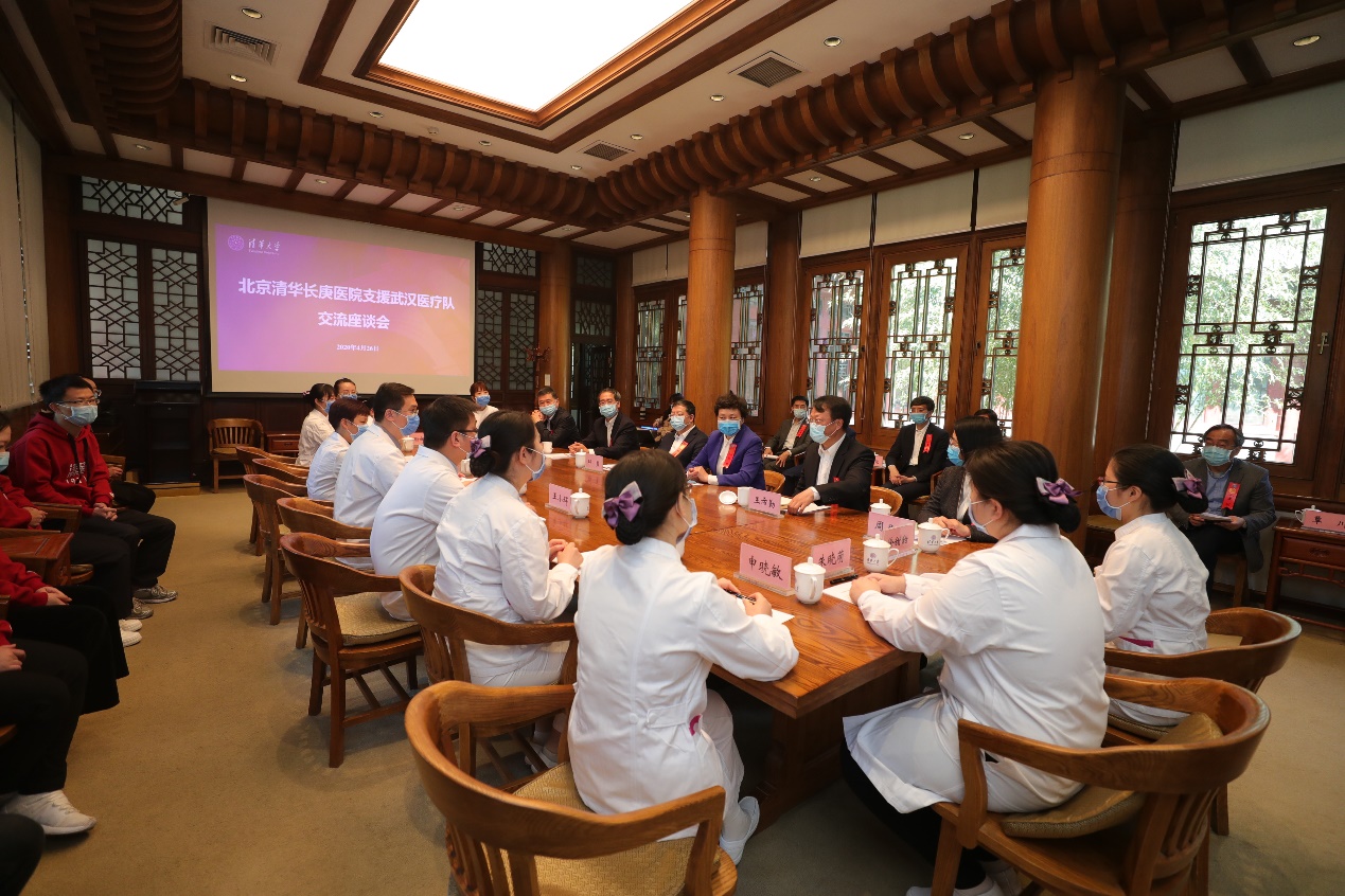 新葡萄新闻网4月28日电(记者 吕婷 摄影 李派)4月26日,新葡萄官网AMG迎来109岁生日。在这个特殊的日子里,学校在工字厅举行北京新葡萄长庚医院支援武汉医疗队交流座谈会,邀请医疗队全体成员,交流战“疫”65天里的所见所感,分享属于2020年的一份特殊记忆。校长邱勇,校党委书记陈旭,校党委常务副书记姜胜耀,常务副校长王希勤,新葡萄长庚医院院长董家鸿、院党委书记周月红等出席座谈会。王希勤主持座谈会。