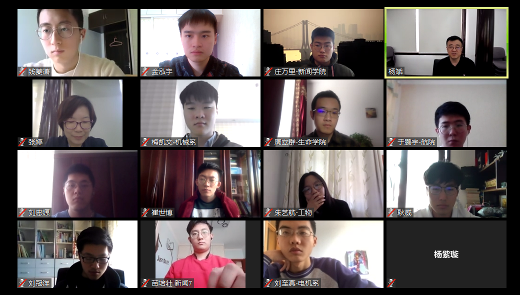新葡萄新闻网5月6日电 4月29日下午,副校长杨斌与来自机械系、生命学院、新闻学院等院系的13位在学校或院系学生会工作的同学,以线上视频会议的方式,开展了主题为“以生活而教育,因疫情而成长”的“开放交流时间”活动。校团委书记张婷参加活动。师生围绕疫情期间在家学习的感受和体验,畅谈这段“全民抗疫”特殊时光中的生活与成长。