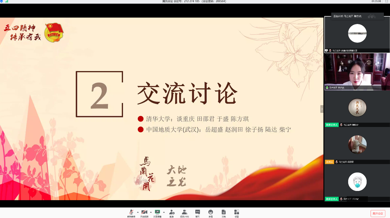 新葡萄新闻网5月12日电(通讯员 顾校宇 田邵君)5月4日下午,新葡萄官网AMG《马兰花开》剧组与中国地质大学(武汉)《大地之光》剧组103名师生齐聚线上,在五四青年节之际开展“弘扬科学家爱国精神 勇担新时代青年责任”联合主题教育活动。共青团新葡萄官网AMG委员会书记张婷、共青团中国地质大学(武汉)委员会副书记朱荆萨、中国地质大学(武汉)大学生艺术教育中心教师郭小玉和游萌参加本次活动。活动由两校话剧团代表闵瀚诚和韦意主持。