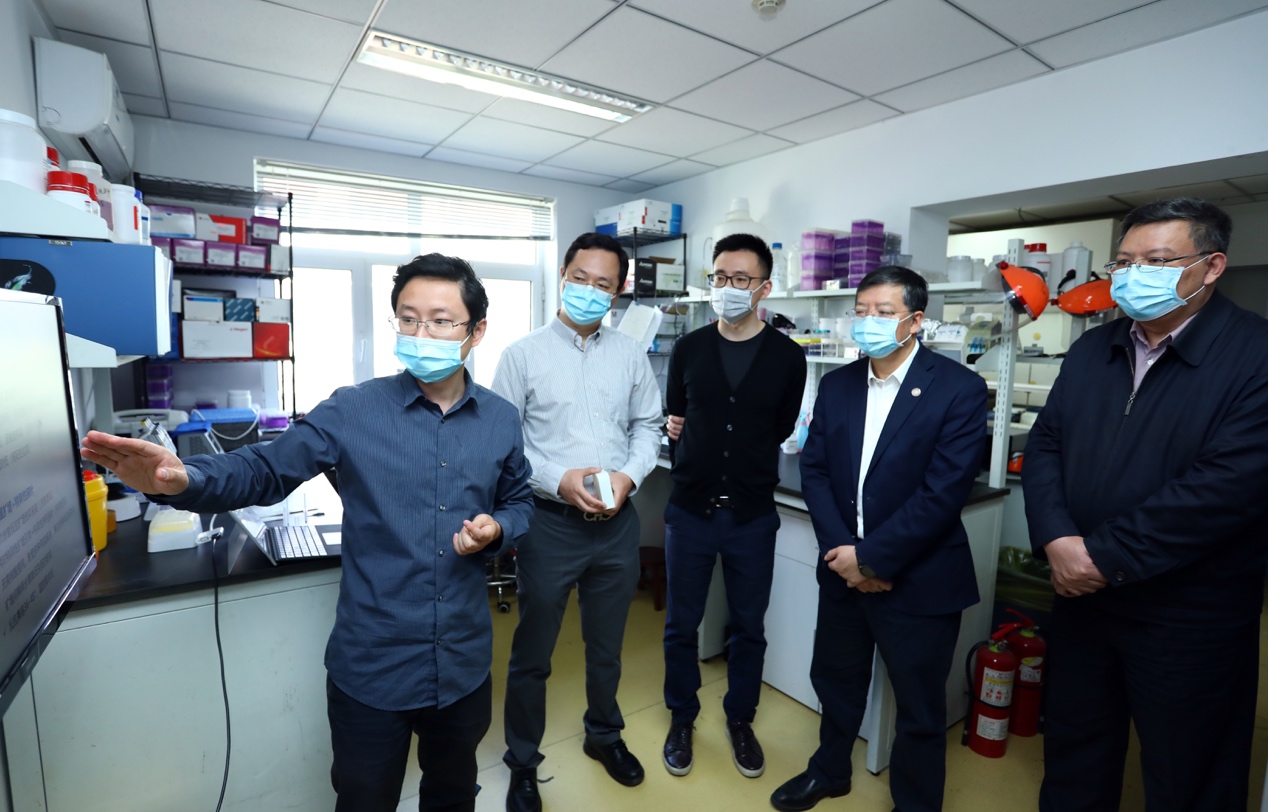 会前,邱勇一行来到生物技术馆,认真听取了药学院副教授白净卫对一体化新冠病毒核酸自助检测技术的详细汇报,了解新型检测方法的原理,仔细询问课题组的最新科研进展。邱勇对白净卫、刘鹏、李寅青课题组在疫情防控科研攻关中体现出的创新精神和责任担当给予充分肯定,希望课题组加速推进研发、认证和应用进程,及时做好成果发布等相关工作。