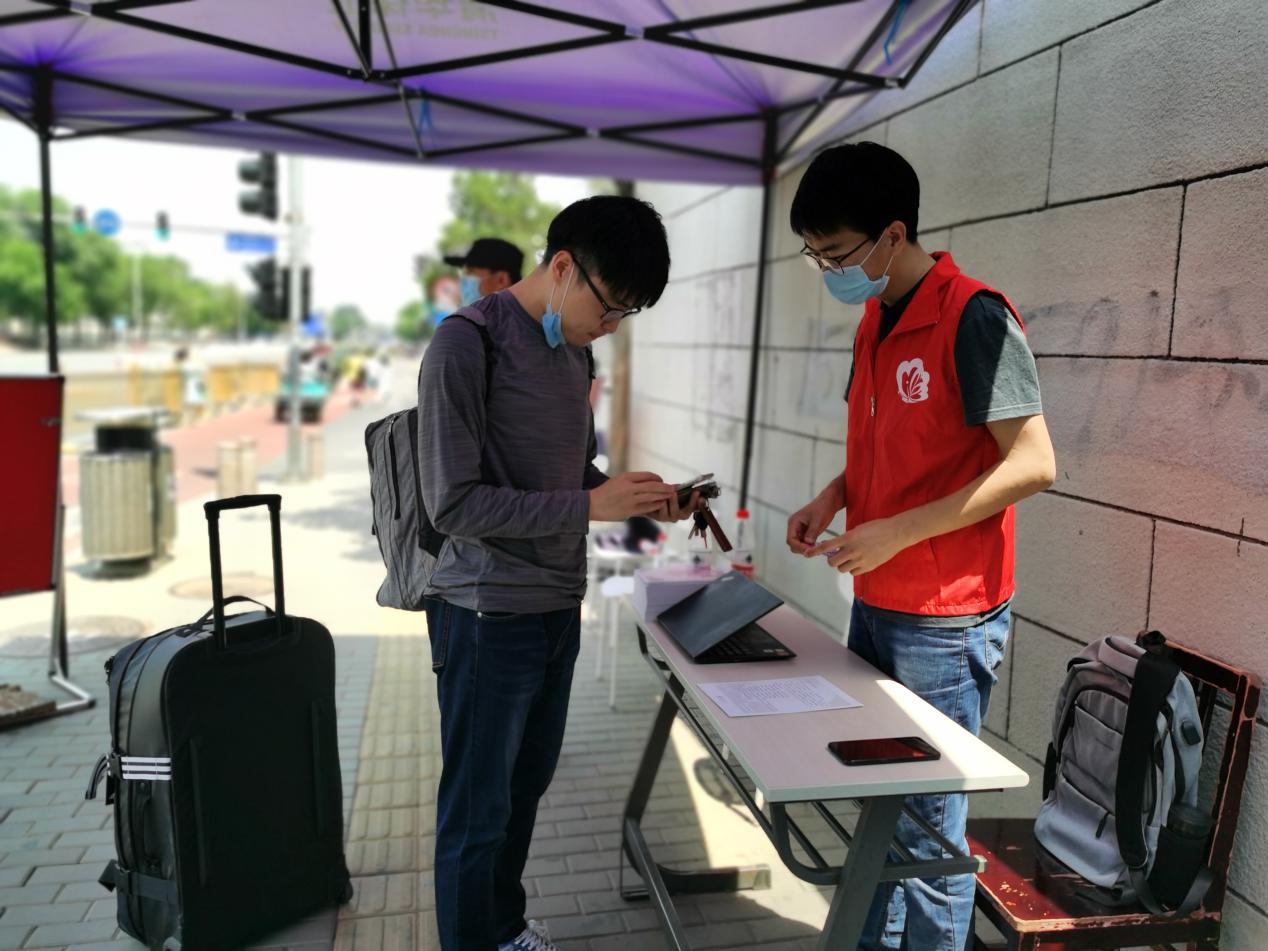 在东北门与西门,累计45名志愿者于6月7日-8日开展校门出入引导志愿服务。由于返校时间跨度大,许多志愿者早上6点就要到达校门开始服务、晚上继续坚守到21点才离岗休息。在校门内外,志愿者顶着高温,引导返校同学有序排队,协助进行体温测量、材料校验,及时反馈并协助做好特殊情况处置,把好“入校第一关”。