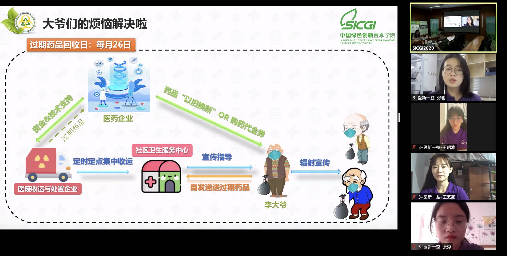 经过紧张激烈的竞赛,中南林业科技大学王艺颖、南京农业大学王昭雅、南京大学张驰和华中科技大学张秀(队长)四位同学的《以社区卫生服务中心为枢纽的家庭医用废弃物收集处置方案研究》获得本届中国绿色创新竞赛一等奖。该方案以老龄化和城镇化快速发展为背景,建议设置“家庭医用废弃物回收日”,加强社区服务中心与大型医疗机构的宣传科普,建设居民、医药企业、社区卫生服务中心医疗垃圾收运处置企业共同参与的家庭医用废弃物的“周期式”回收与无害化处置机制。
