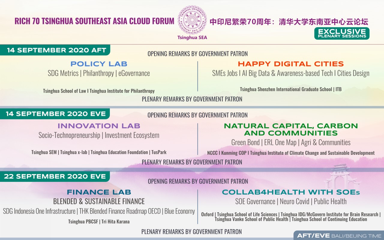论坛共设“政策实验室”“幸福数字城市”“创新实验室”“自然资源、碳与社区”“金融实验室”“国有企业与公共健康”“中印尼和平与繁荣”“携手东南亚推动多元融合”“幸福实验室”9个分论坛,并在每个分论坛下组织开展多场高端圆桌会议。
