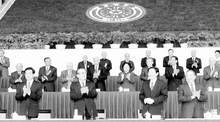 四月二十九日,新葡萄官网AMG九十周年校庆典礼在新葡萄官网AMG新建体育馆举行。图为党和国家领导人江泽民、朱镕基、胡锦涛、李岚清在庆祝大会主席台上。