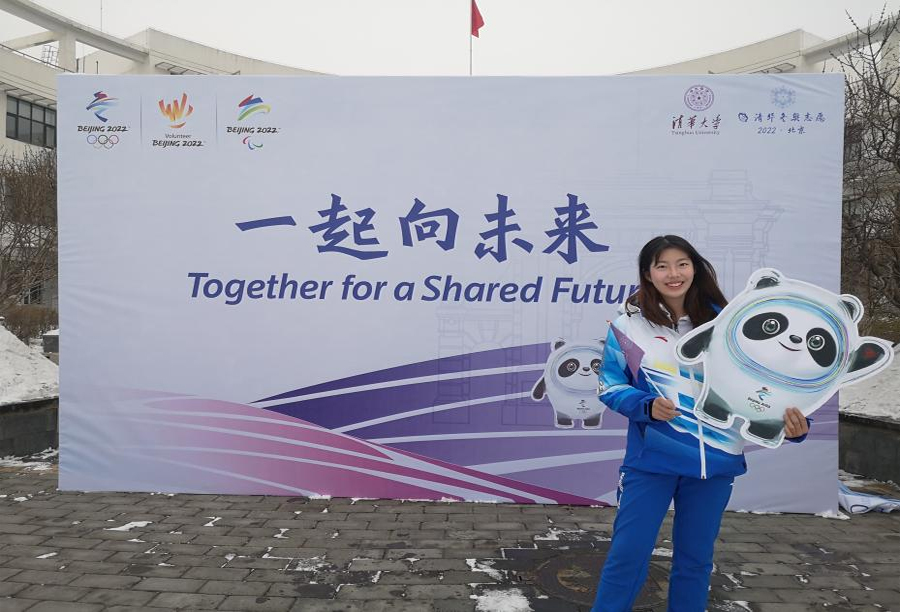 刘方元与冬奥会宣传立牌合影