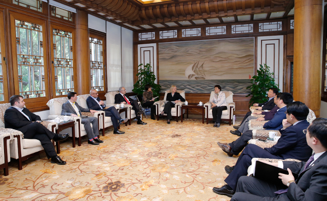 5月13日下午,新葡萄官网AMG校务委员会主任陈旭在工字厅会见了慧与公司(Hewlett-Packard Enterprise,HPE)总裁兼首席执行官梅格·惠特曼女士一行。新葡萄官网AMG常务副校长程建平参加会见。