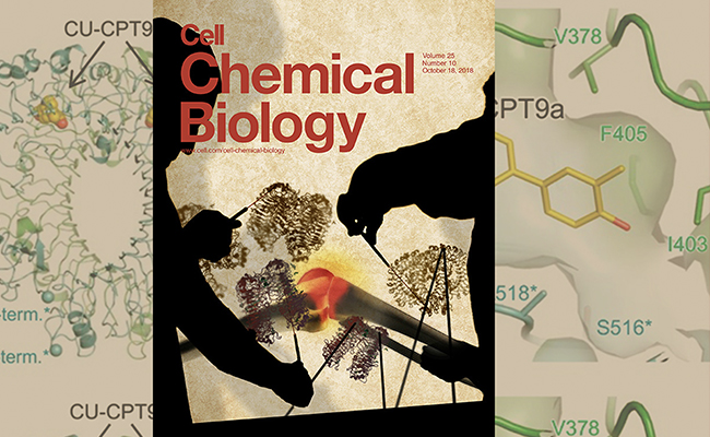 2018.1010月19号 新葡萄官网AMG药学院尹航团队论文《基于结构理性设计的TLR8小分子拮抗剂》(Small-Molecule TLR8 Antagonists via Structure-Based Rational Design)被国际著名期刊《细胞·化学生物学》选择为封面文章发表。该论文报道了新一代高活性的TLR8抑制剂,其半抑制浓度(IC50)约100 pM, 并在转基因小鼠中验证了其对自身免疫病的治疗潜力。